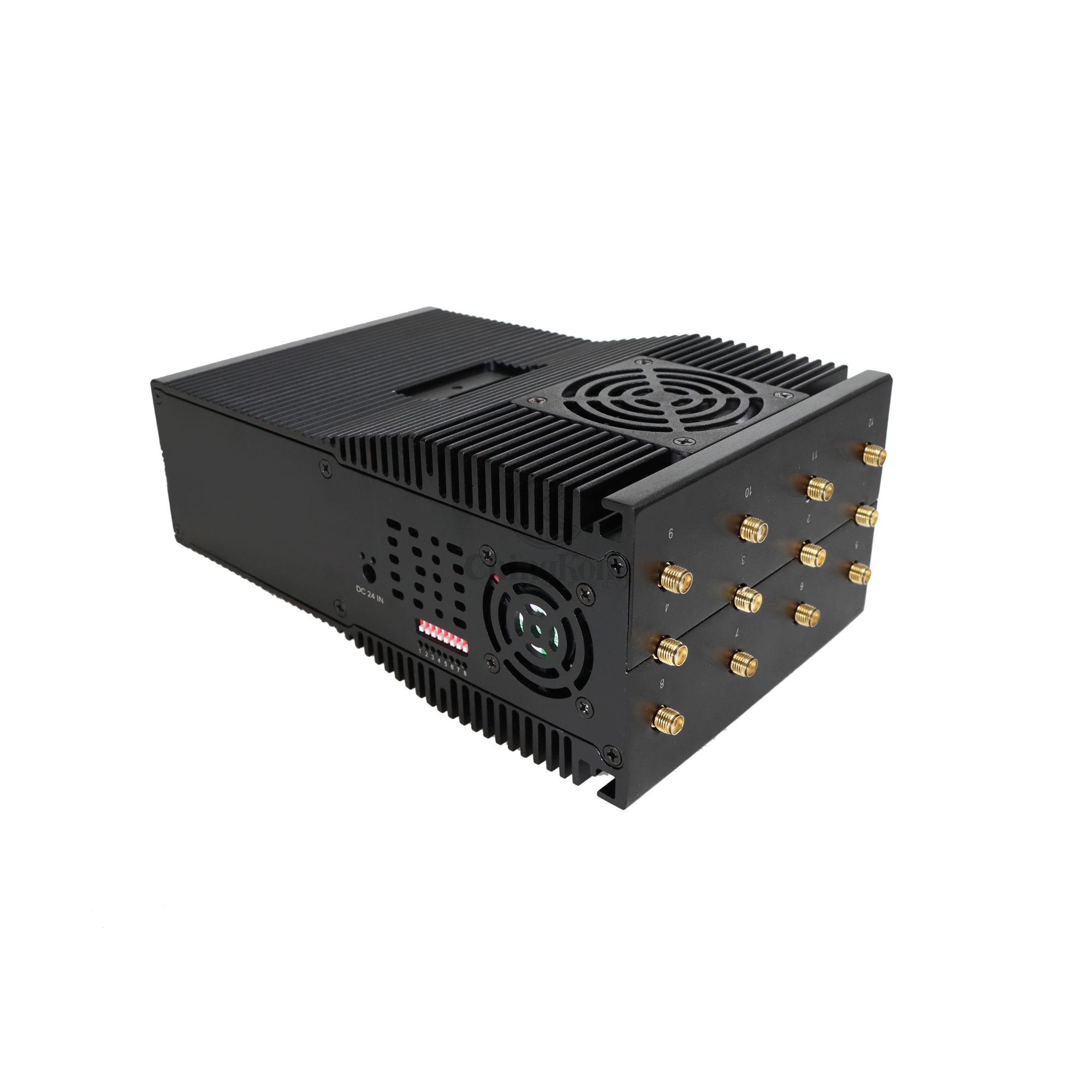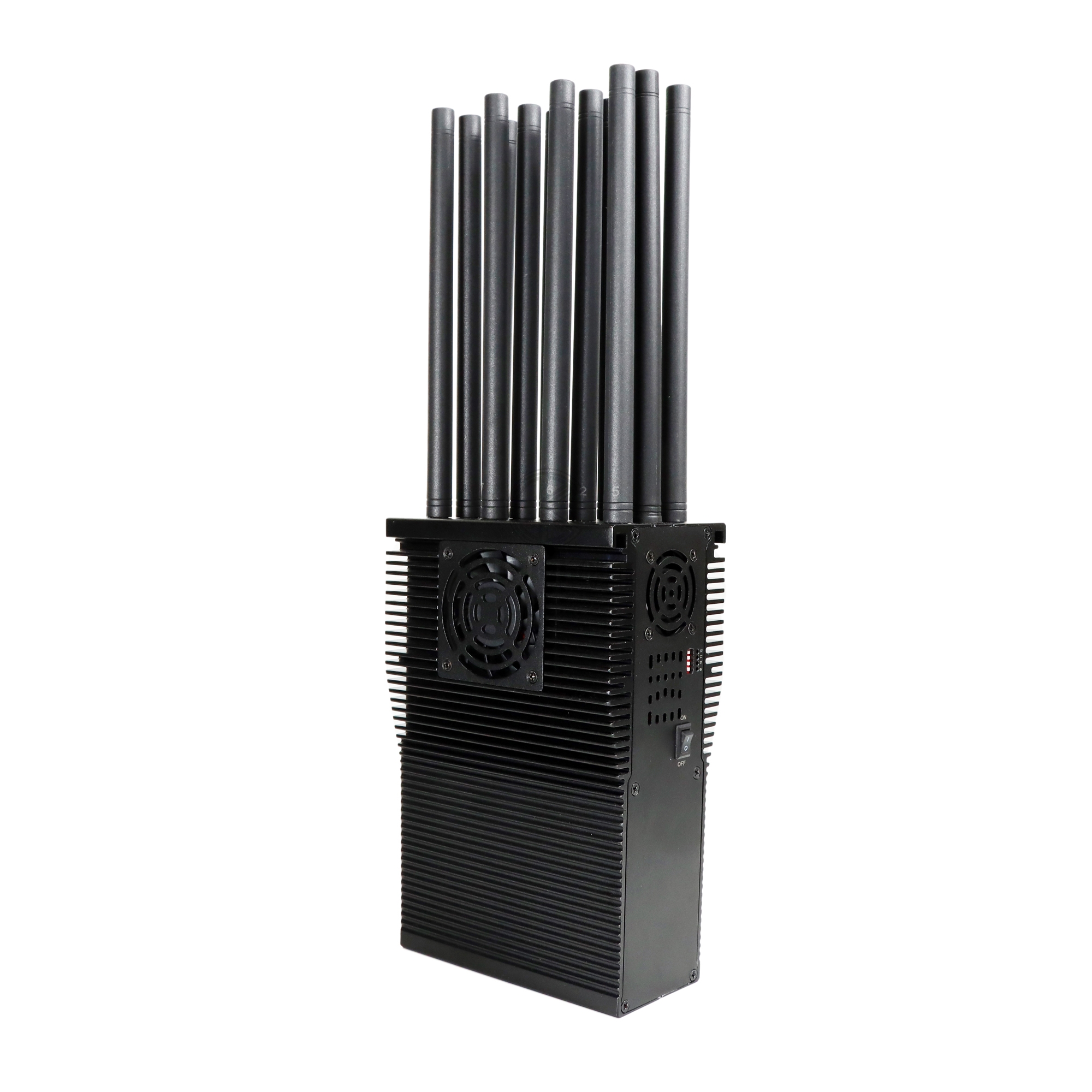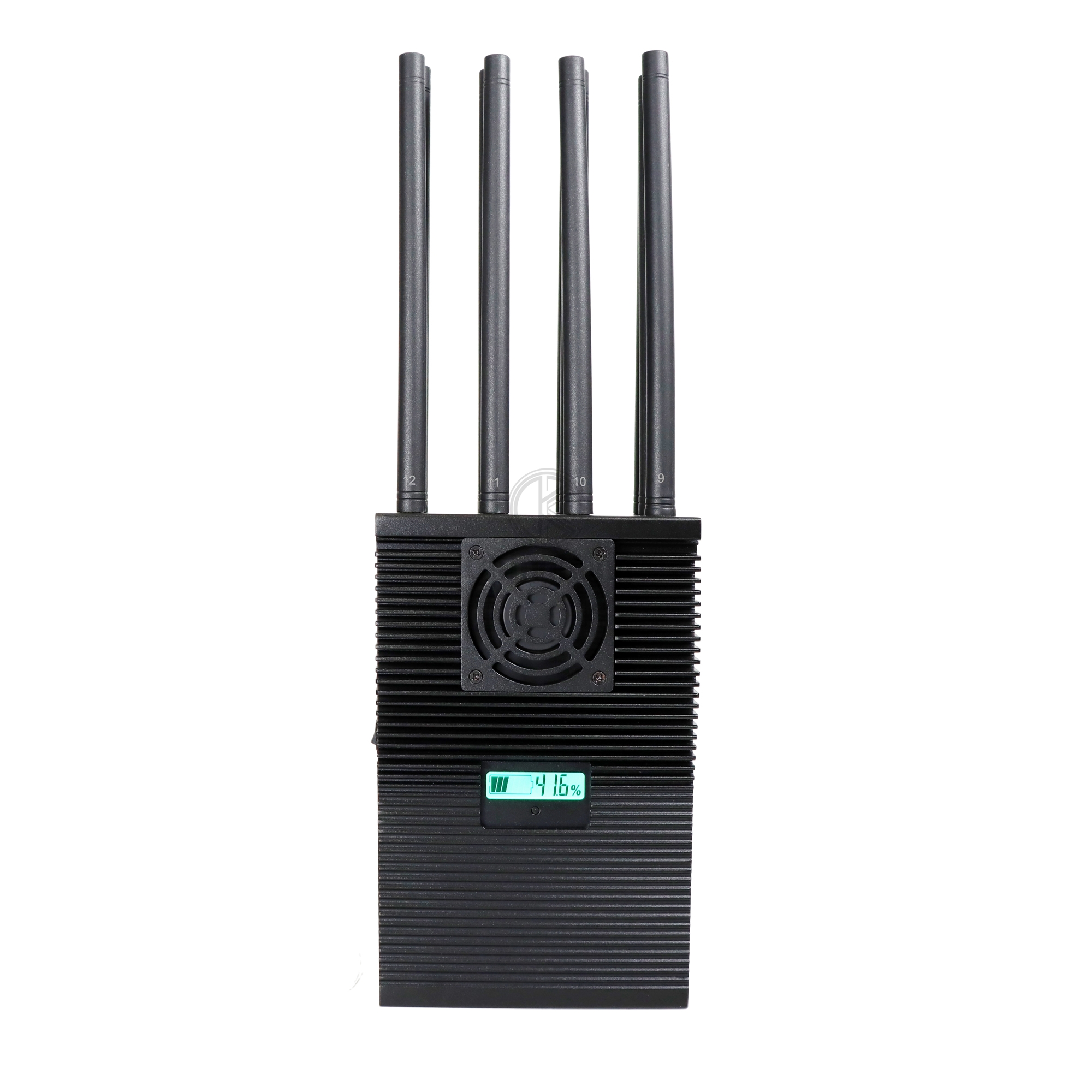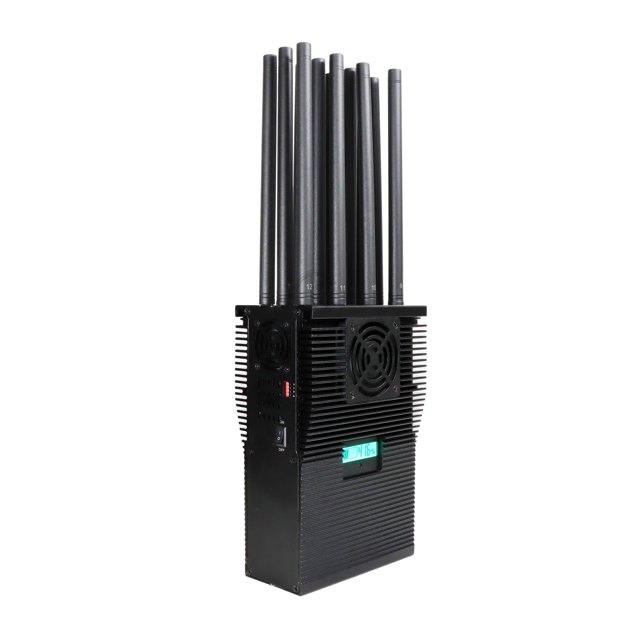 新型高功率44瓦12天线手持设计的手机信号干扰器,干扰范围达60米,适用于所有类型的Android手机,平板电脑,智能手机,iphone, Win手机等,使用2G, 3G, 4G 5G, CDMA 450Mhz, Block GPS, Wi-Fi 2.4G 5G, UHF/VHF步话机和LORA,LOJACK等。电池容量LCD显示(容量百分比,工作电压/电流)在市场上很流行。良好的散热系统,内置散热器和4个大风扇,可在车内充电和交流电源